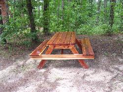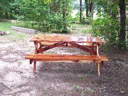 Red cedar picnic table with attached benches. This aromatic red cedar picnic table would make a beautiful addition to your patio, deck or back yard. Price: $280.00 finished.